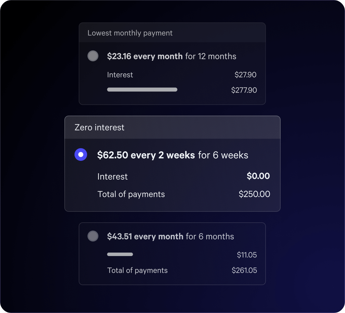 Know exactly how much you can spend and choose the payment plan that fits your budget.